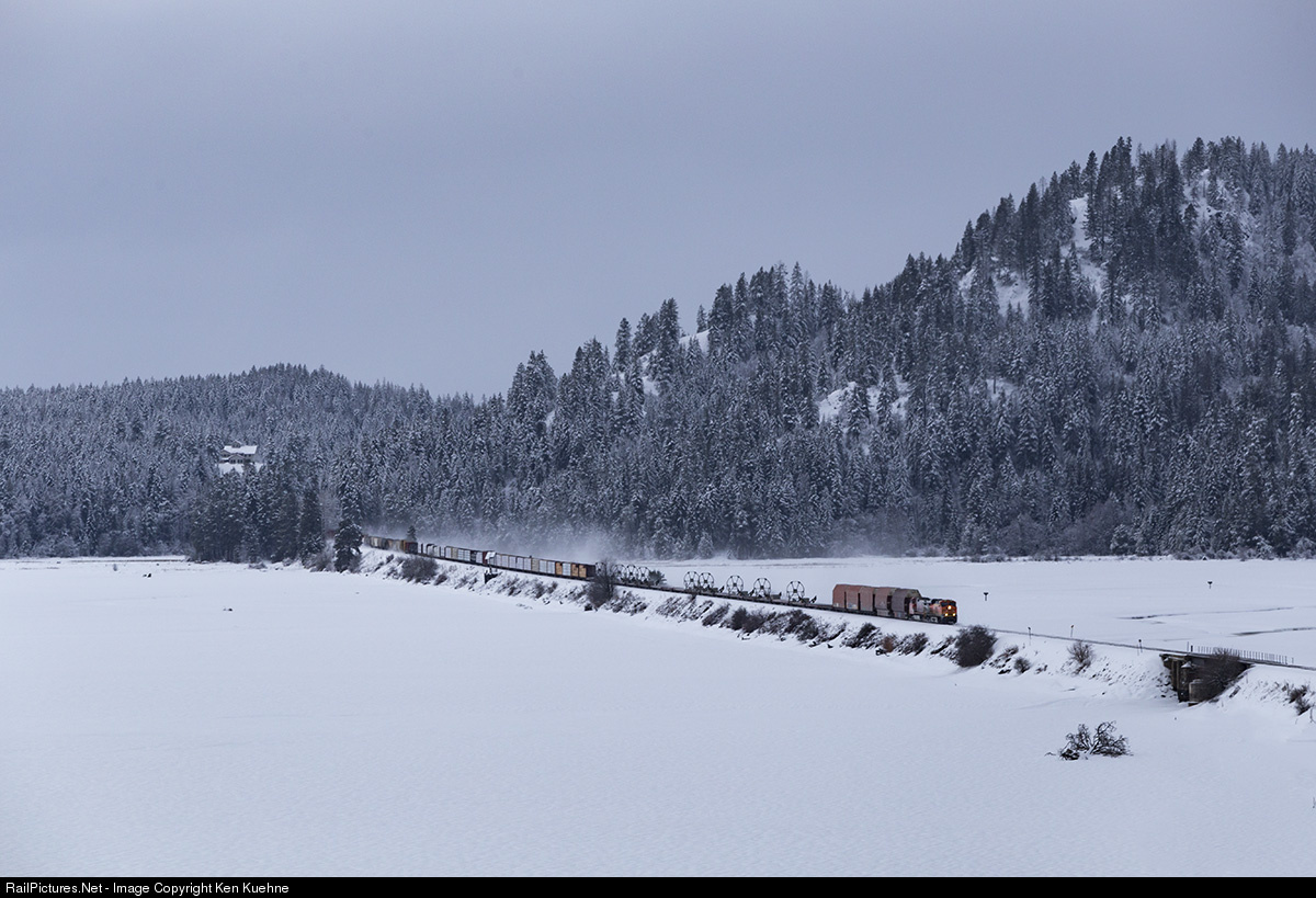 | BNSF 6621 kicks up snow as it crosses the Pack River Fill along Lake Pend Oreille. Up front are empty Boeing loads returning to the midwest for new Boeing fuselages. An overnight snow storm has dumped a couple fresh inches of snow here, and more is expected later this day. |