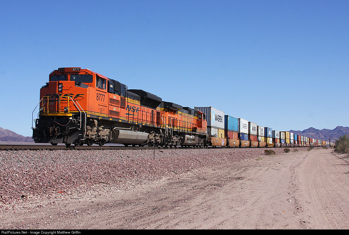 | Waiting 3rd out in a pack of stopped eastbounds, BNSF 8777 has the duty's this day as the rear DPU on this S-LBALPC stack train at Hector. |