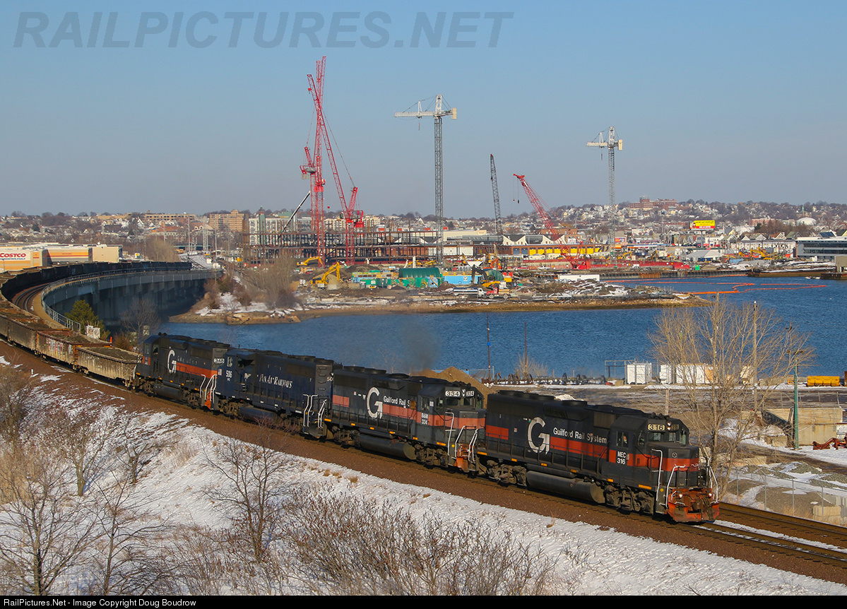 | Pan AM Railways train SALO leaves Everett with a four engine lashup of GP40s. The train is crossing the Mystic River with 27 loads of contaminated soil from the construction site of the new Wynn Casino. The progress of the casino can be seen in the background with all of the large cranes and machinery working at a steady pace. Rumor has it this train only has one more week of duty before this stage of the project is complete. |