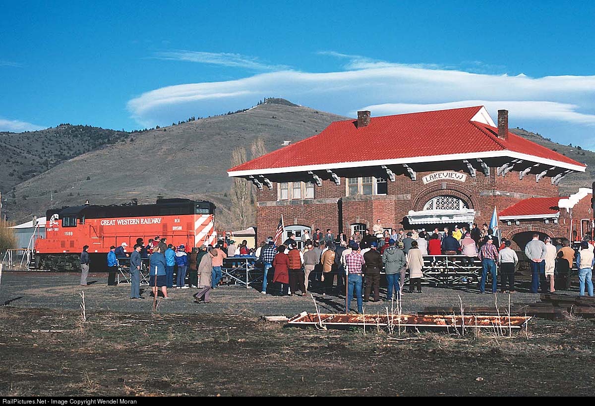 | Citizens of Lakeview, Oregon celebrate Lake County's purchase of the SP branch line to Alturas. When the depot was constructed by the Nevada-California-Oregon, the rails in front of it were only three feet apart. |