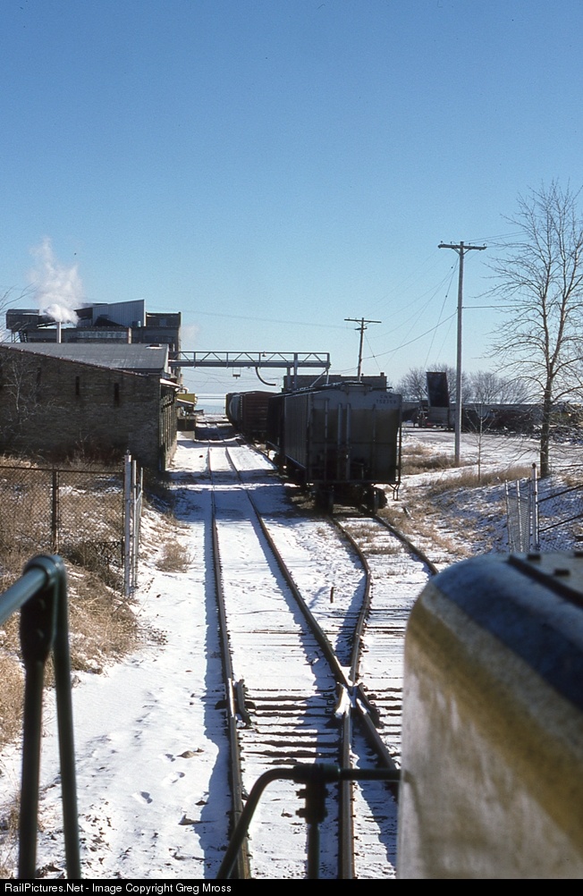 We are aboard CNW 4479 as it heads to switch the fertilizer plant in Carrolville, WI in January of 1991. Once a busy industrial area, this is all that left to switch at this time. Lake Michigan is in the background.