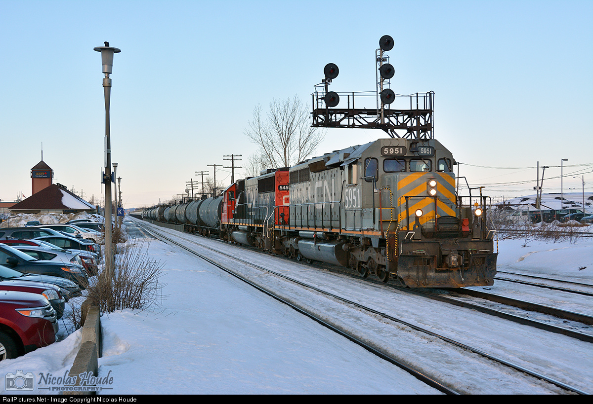 | An old SD40-3 paired with an SD60 are pulling 3959 feet of train at Dorval QC on north track. The CN L58621 18 consists of empty TankTrain loads from Maitland ON, and local traffic from Brockville. |