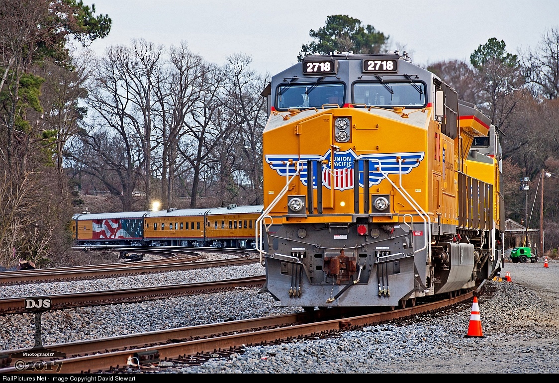 | Union Pacific's OCS train stands in Atlanta, Georgia twelve hours prior to it's morning departure which will take railroad officials of NS, KCS, and UP to the Left Coast. A new UP ET44AC and SD70ACe provide the muscle and will show shippers the newest in motive power. |