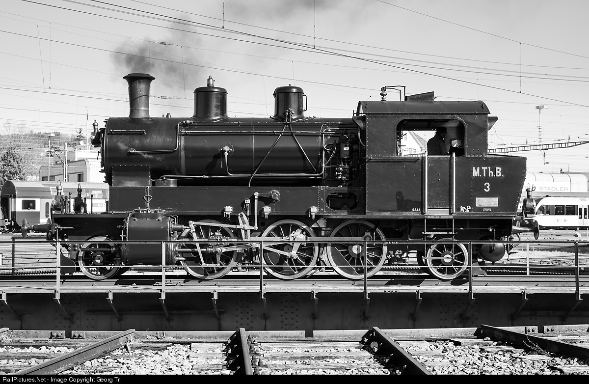 | This handsome 2-6-2 T "Prairie" steamlocomotive was built in 1912 by the Swiss Locomotive and Machine Works (SLM) in Winterthur for the Mittel-Thurgau-Bahn (MThB). It is now owned and operated by association historic Mittel-Thurgau-Bahn (VHMThB) and based in Romanshorn. Here it is standing on the turntable in Wil (SG), on the occasion of the "Winterdampf" train from Nesslau via Wattwil-Wil-Weinfelden to Romanshorn. |