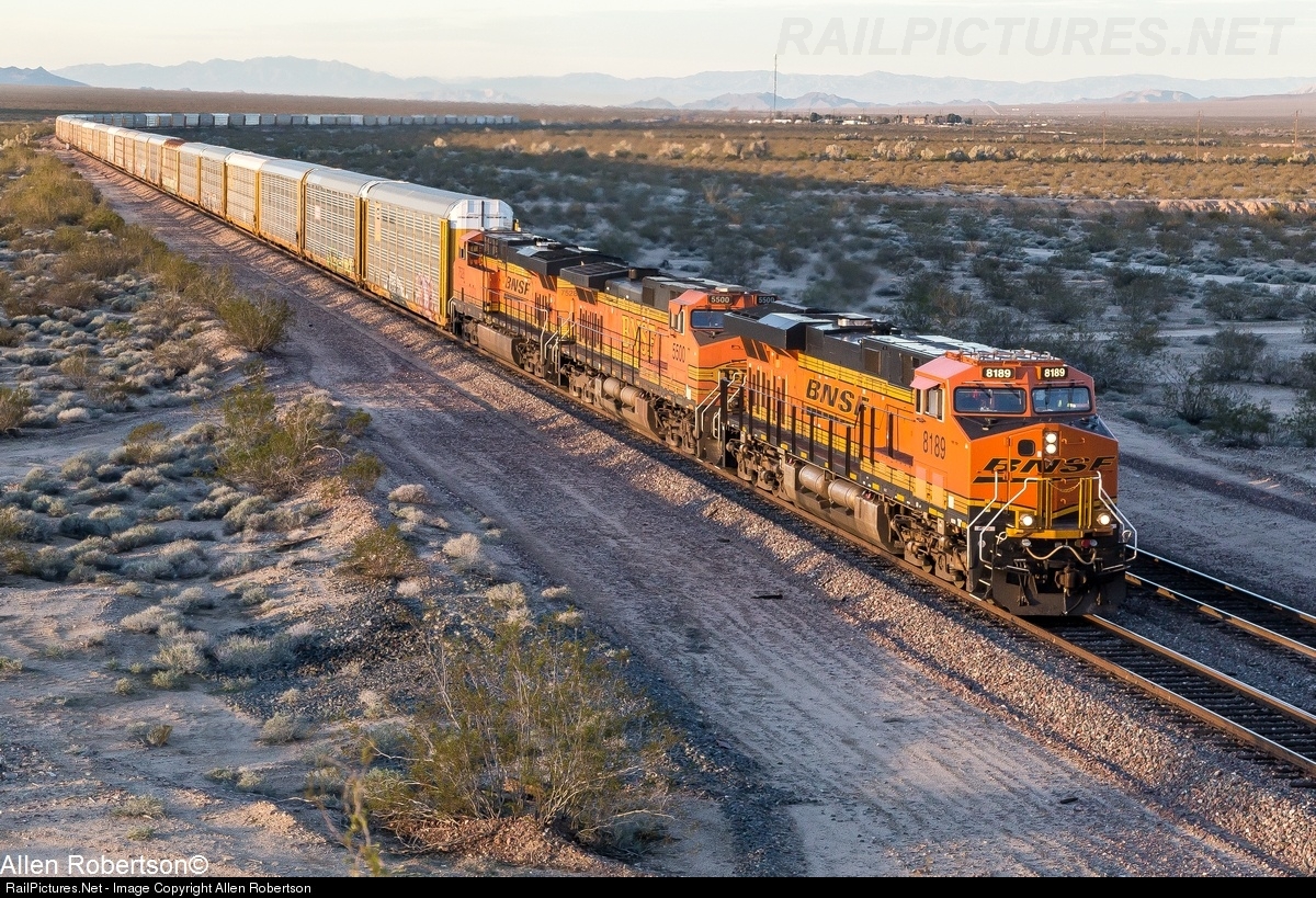 | BNSF 8189, 5500, & 7528 are about to pass under National Trails Hwy with eastbound auto racks near Essex, CA. |