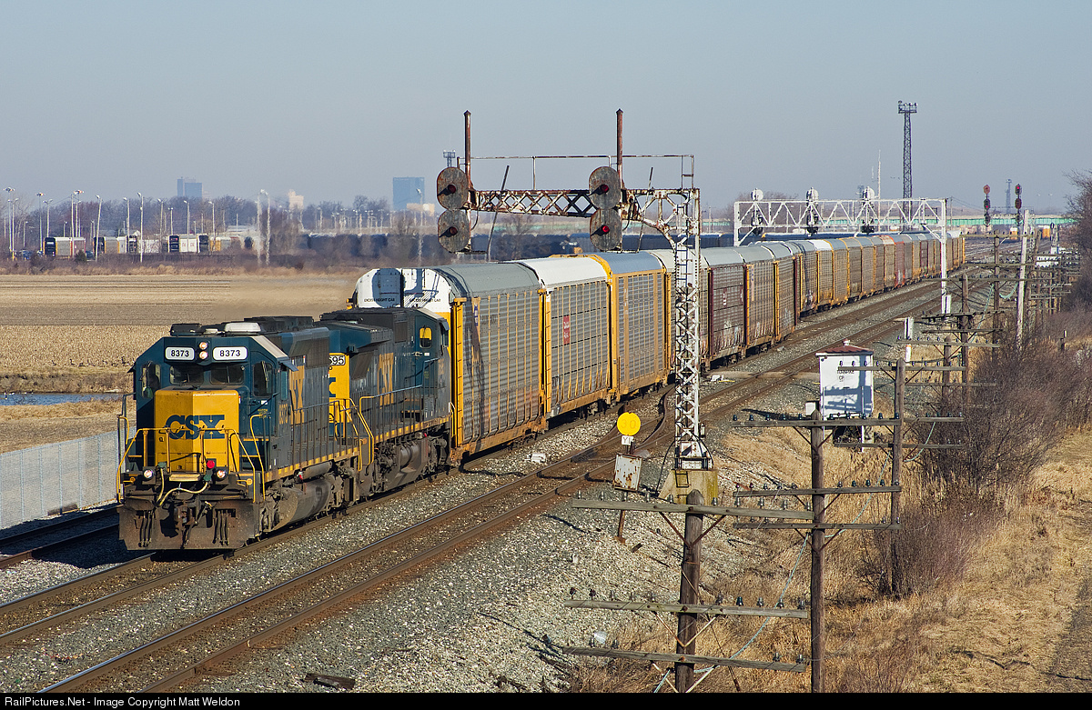 | CSXT 8373 and 7695 brings a load of auto racks up to Turnpike CP and then shoves back into the Walbridge Yard for other switching duties. The foreground C&O signals are unique, in that the signal heads had to be lowered due to the Ohio Turnpike being built. |