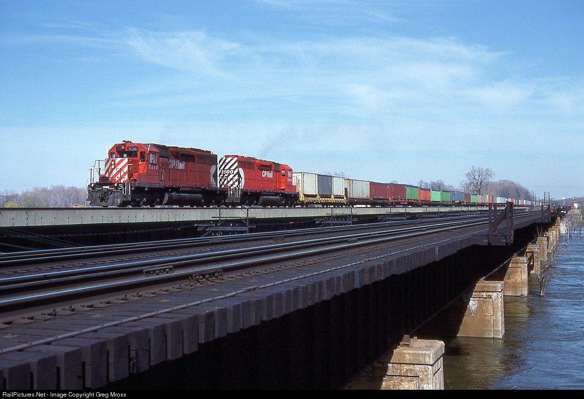 | CP 5510, a straight SD40, is crossing the Ottawa River near Dorion, Quebec in May of 1988. |