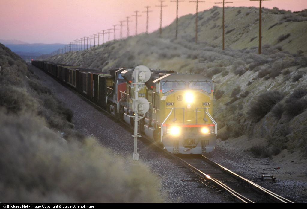 | UP 8137 West, a heavy coal train that got onto the BNSF at Barstow, steps over the east switch at Bissell at dusk on its way to Mojave. |