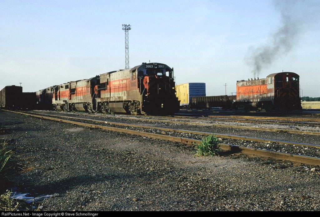 3063 West has just pulled to a stop at the west end of Stockton Yard as a Baldwin VO-1000 takes care of switching duties.