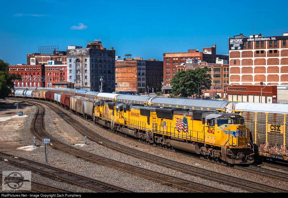 UP Train MCBKC 15 slides up the KCT North-South Corridor Track 80 at Old Union Depot Interlocking for the incline around a now tied down and dead UP Train ANGNS 13, led by UP 8042 and UP 7680. This manifest train is completing its "Trip Around the World" to UP Neff Yard after coming off the Spine Line this morning.