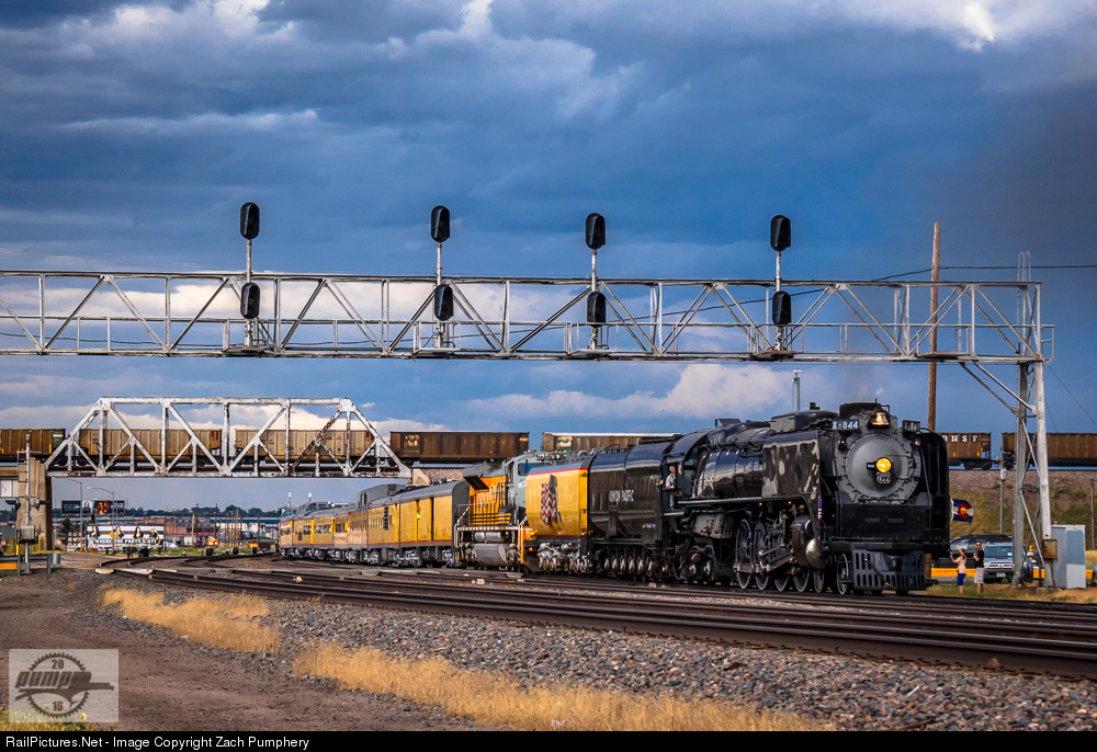 After departing the depot at 1700 sharp, UP Train PDVDV1 23 stomps through the UP Larmie Sub. crossovers and under the classic UP Signal Bridge at MP 511 and out of town, headed back to Denver with the Frontier Days Special behind 844 and 1989. On the famous C&S Bridge above the train is a stopped northbound empty coal train on the BNSF Front Range Sub.
