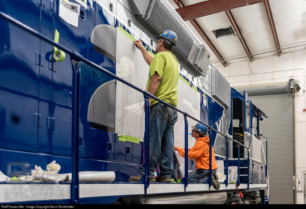 Metro East Industries workers, Eric and Kenny, work to apply the large vinyl lettering to complete the Lake State Railway's 25th Anniversary GP40-3 slug mother, LSRC #4325. The crew performed quality work with meticulous detail as they applied and shaped the vinyl around hinges and in the crevices that make up the side of the EMD carbody. A full time-lapse video shows the 2-day process that was required to emerge the silver and blue geep in the anniversary scheme: https://youtu.be/NzSpNQsCMUY