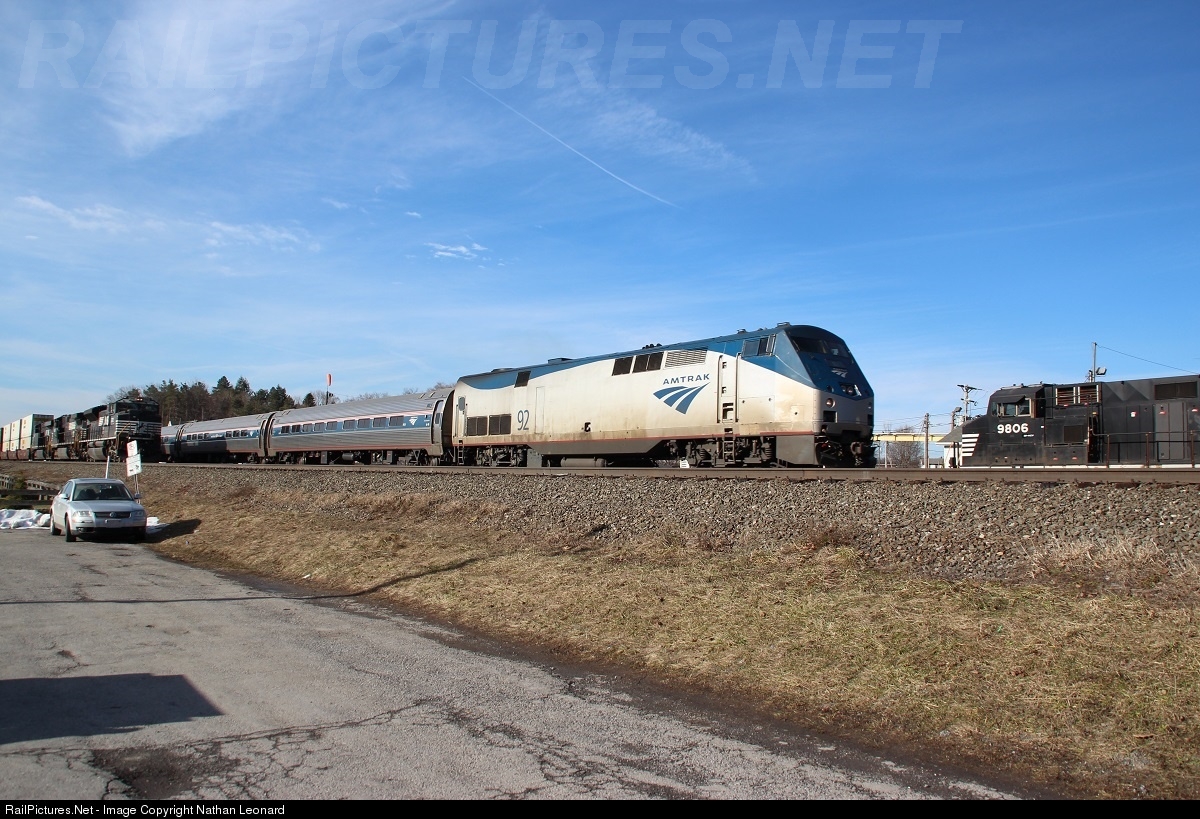 | Triple the action!! Amtrak trains leading by 92 goes around an intermodal through Cresson, PA and passes a set of locomotives making its way to South Fork. |