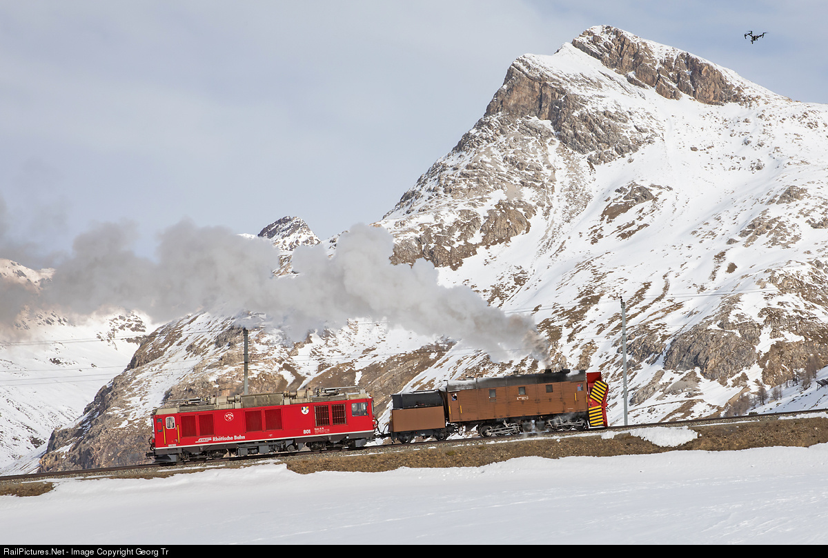 | Drone traffic is evident in the Bernina pass region, when steam rotary snow blower Xrot d # 9213 and dual power locomotive (diesel and electric) Gem 4/4 # 801 are running on the 7.0 grade on the Alps da Buonds, with 2974 meter high Piz Alv in the background. |