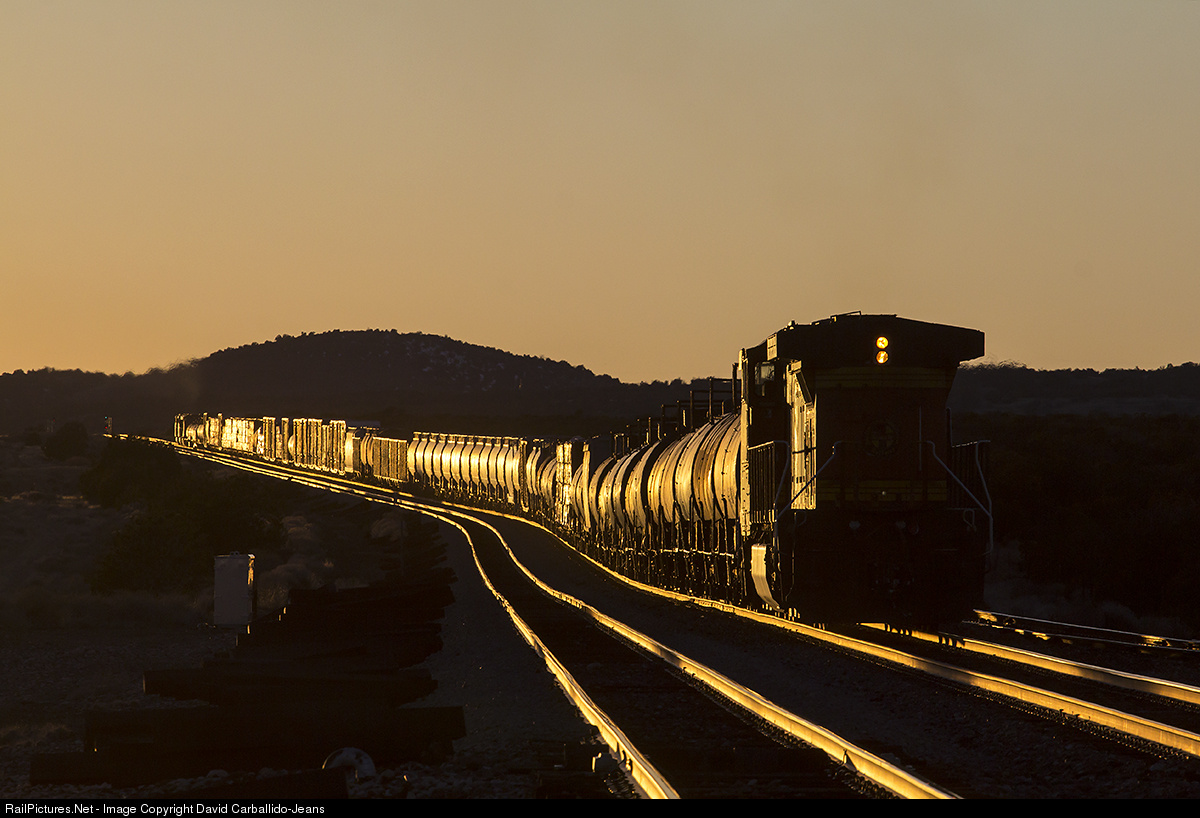 A heavy Belen, NM to Phoenix, AZ manifest train fights gravity as it slowly moves over the eastern slope of the Arizona Divide on the first day of March, 2017. As the sun fades behind the horizon, the four locomotives moving this train will battle the grade for another hour, or so, till they reach the summit of the divide; some 7,300 feet above sea level. From there, it will be steep downhill grade of combination of high speed, double track mainline and track warrant control territory till the train reaches Phoenix.