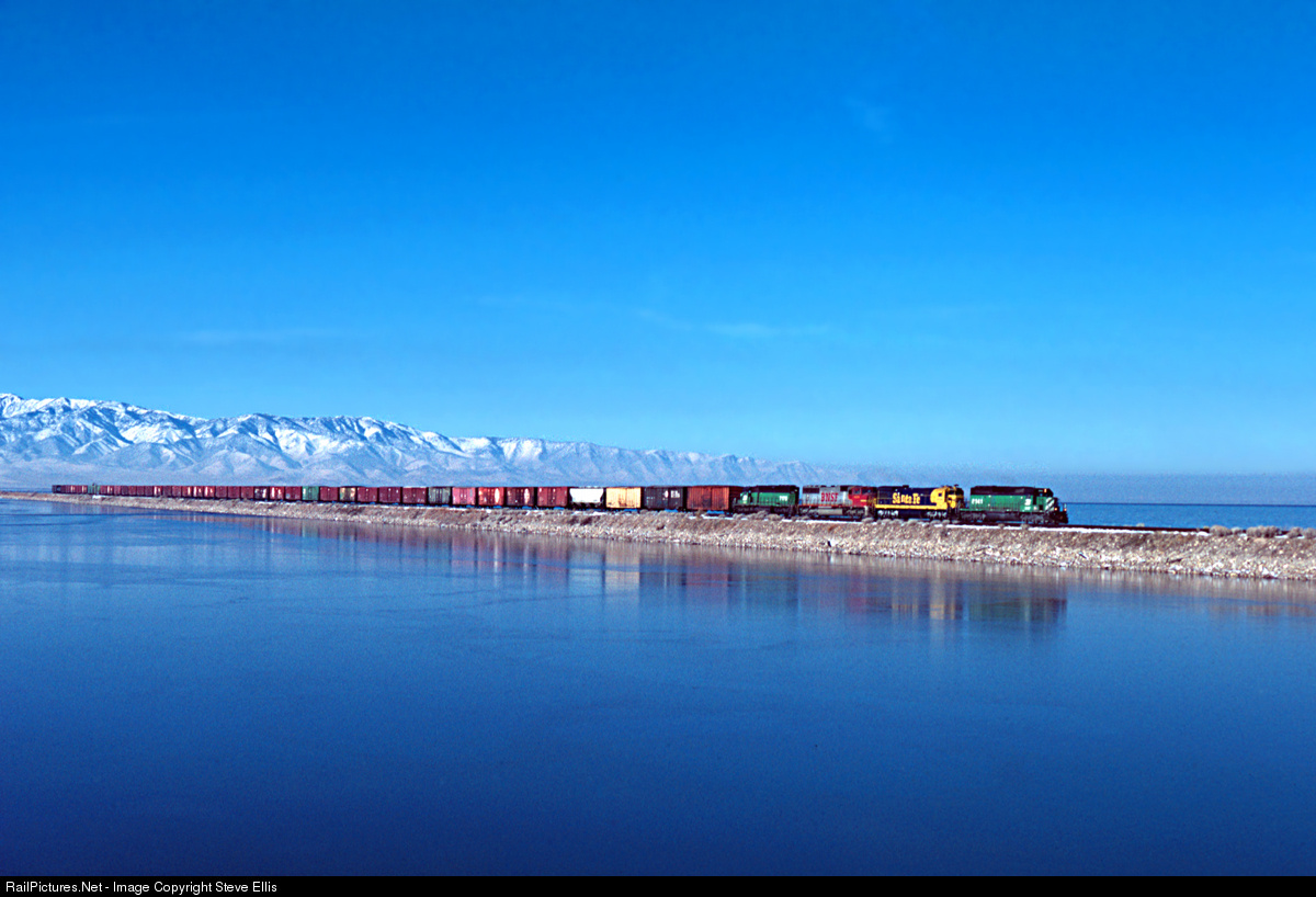 The early days of the Burlington Santa Fe merger created some colorful trains. BNSF trackage right train's also brought a whole new element the local seen. BN 8141 ATSF 9546 BNSF 8255 and BN 7170 cross the Great Salt Lake on the ex-Western Pacific causeway eastbound.