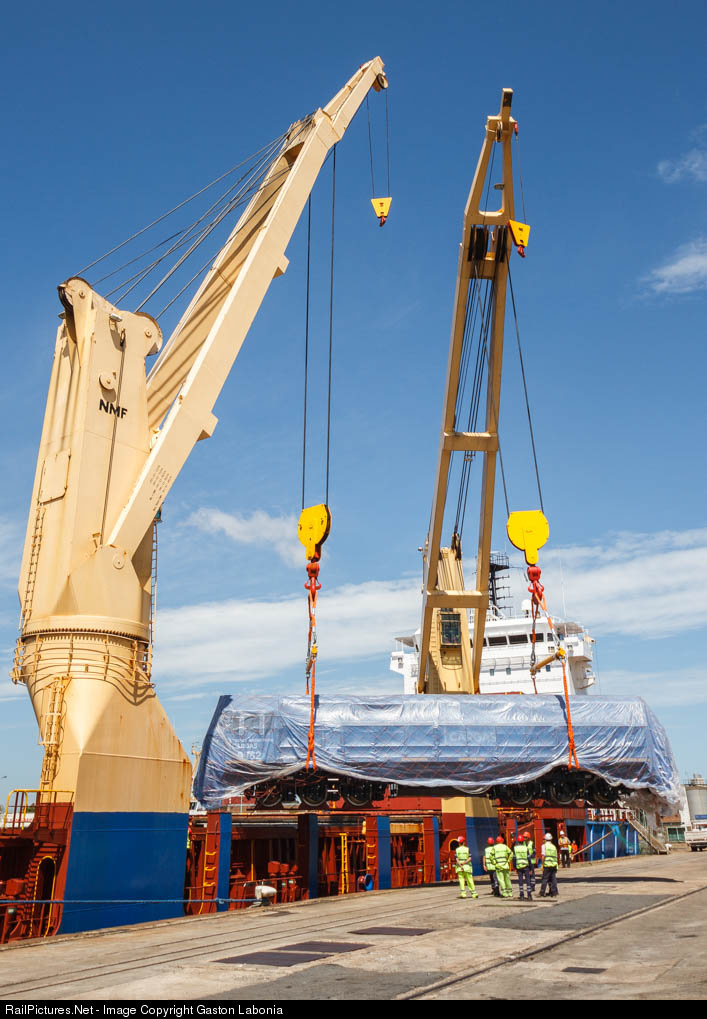 Brand new chinese locomotive CRRC CDD6A1, 1000 mm gauge, being unloaded from the ship.