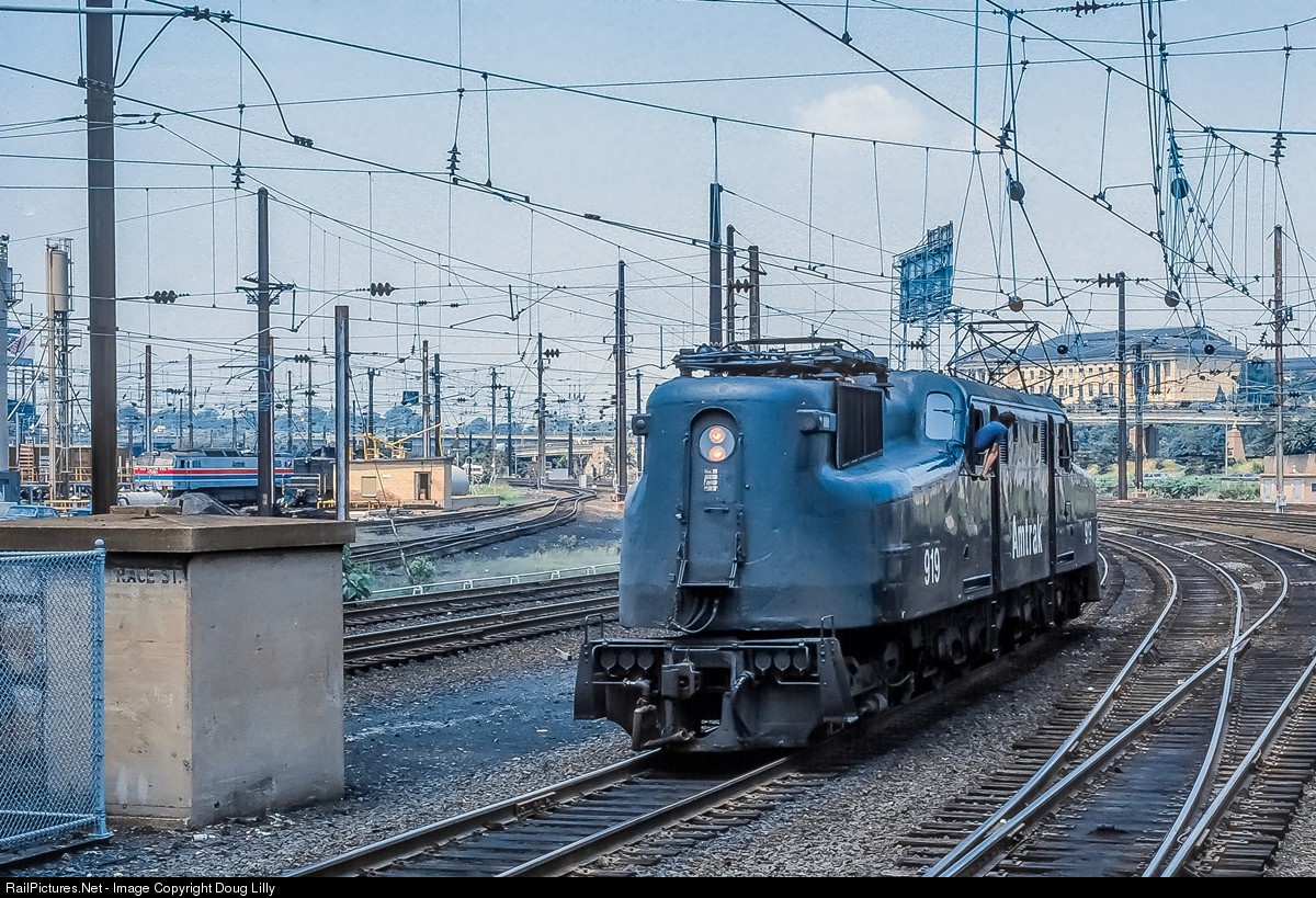 A Harrisburg train has arrived at 30t Street Station in Philadelphia, and the hostlers are taking the GG1 to the Race Street engine terminal. I’m not sure what the crewman is looking for, but he is leaning as far out of the big electric as far he can. The E60 seen as an SW1 moved in to take the cars for servicing is now in the engine terminal.