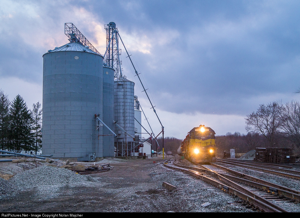 All is silent as a light snow begins to fall in the small town of Sullivan, Ohio on a bitterly cold Winter evening. That silence is soon broken as loaded grain train G008 rolls through town led by DME GP40-2 No. 4002, blaring its airhorn as it approaches the Route 58 grade crossing. The train is running east on the former B&O, now CSX New Castle Subdivision and is destined for Brunswick, Maryland.