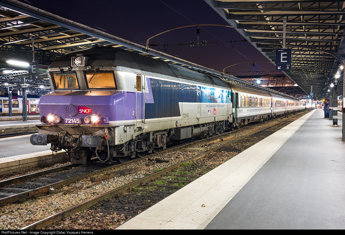 | Night falls in Paris and veteran CC 72145 waits to leave with the Corail Intercity to Belfort, parked on track 9 of the Gare de l'Est. currently, these trains are being replaced by the Coradia Liner of New Generation, Little by little it is ceasing more and more the conventional trains of the French network. |