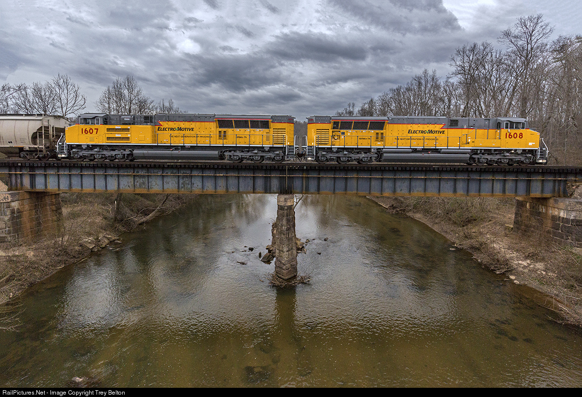 | The EMDX 1608 along with its twin the EMDX 1607, lead the NS 56W south over the Mayo River on the Winston-Salem District. The 80 car load of corn was bound for Ingredion in Winston-Salem, NC |