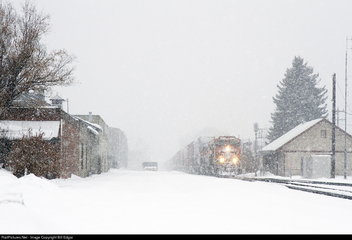 | As eastbound stack train slows in downtown cashmere to enter the siding for a meet with a westbound stack train. After a long winter of snow, another heavy snow fall was not particularly welcome, but this one did not amount to much as warmer temperatures have melted much of the snow in the Wenatchee Valley in the past week. |