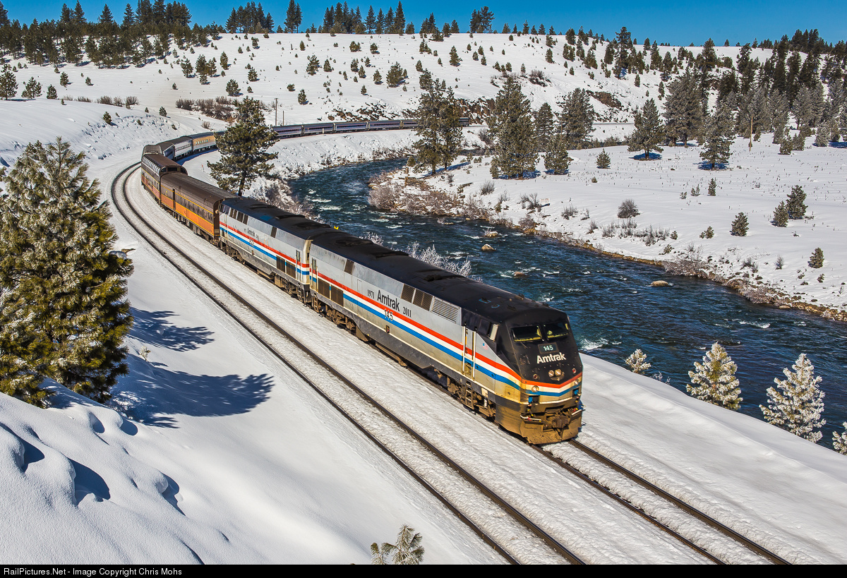 | After several Cancelations due to weather on Donner pass this winter, the first Sierra Scenic train and the First Reno Fun Train make their first runs from the bay area to Reno and back. Heritage Units No.145 and No.822 roll westbound from Reno following the Truckee River on a brilliant winter day with the Sierra Scenic. |