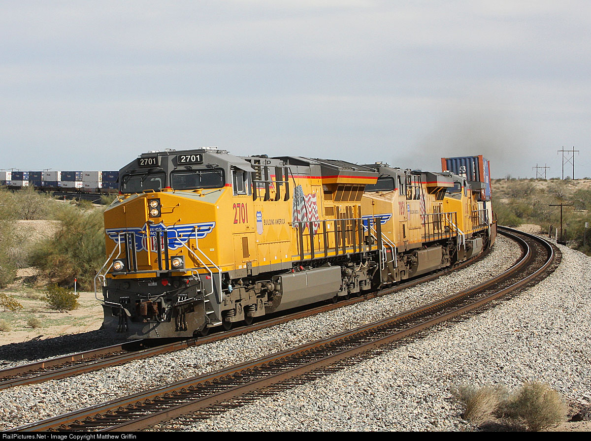 | West of Wellton on UP's Gila Sub, GE ET45AH 2701 leads a fast moving intermodal as it races towards a crew change at Yuma. |
