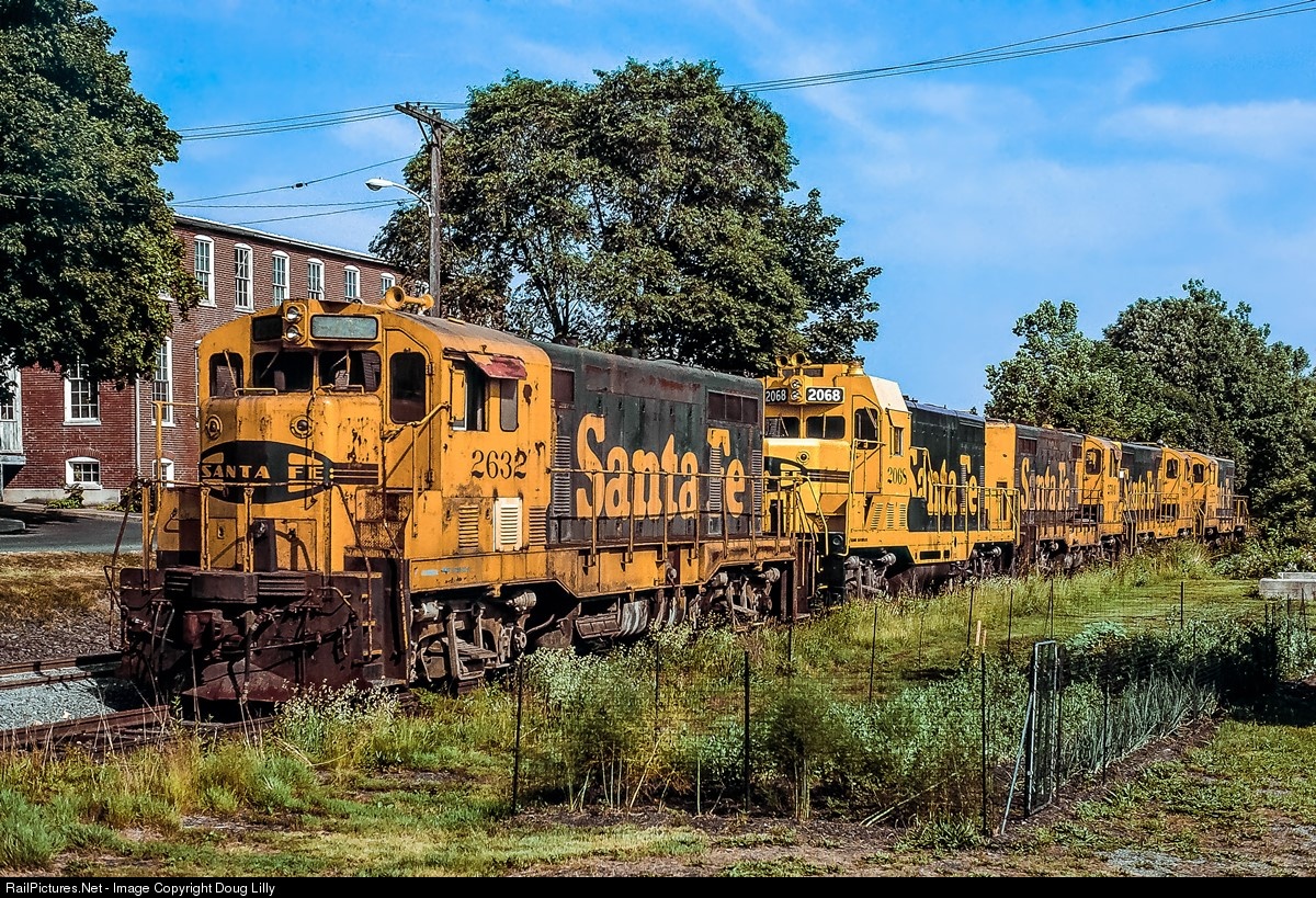 In 1984, Andy Muller, owner of the fledgling Blue Mountain and Reading, purchased a wholesale lot (certainly upwards of 20) CF7’s from the Santa Fe, with at least one GP7u thrown in for good measure. After cleaning up and painting two for the BM&R, Muller’s forces overhauled the rest and resold them to short lines up and down the east coast. In the interim, they were stored in sidings all along the BM&R main between Temple and Hamburg. Here five of the refugees await their rebuilding on a siding near the old PRR station in Shoemakersville, Pennsylvania. Somehow, I don’t think that the Santa Fe’s rebuild designers’ names will ever be uttered in the same breath as Loewy, Kuhler, or Dreyfus.