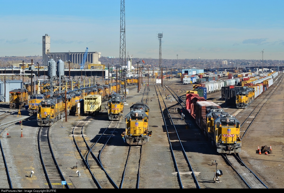 | Its a busy morning in the UP's North Yard as light power dominates the scene. The crew of UP 710 (ex Missouri Pacific GP38-2) dismount after bringing their pair of engines to the yard. Meanwhile, UPY 625 (ex Missouri Pacific GP15-1)pushes a cut of cars back into the ladder as UP 1359 (ex Denver & Rio Grande Western GP40-2) waits for its turn. To the left of UP 710 sits UPY 681 (ex Missouri Pacific GP15-1) and UP 1370 (ex Denver & Rio Grande Western GP40-2) gets ready to move away from the sand towers. |