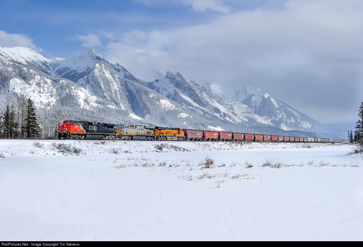 Due to ongoing problems on BNSF's Hi-Line subdivision in Montana, there have been quite a few grain trains detouring on CN tracks between Vancouver, BC and Emerson, MB/Noyes, MN. Here we see CN C44-9WL 2503, CREX ES44AC 1317 and BNSF ES44C4 4261 leading CN F30651 05 (a.k.a. BNSF X INBNIL9 04) eastward on CN's Edson Sub at Henry House.