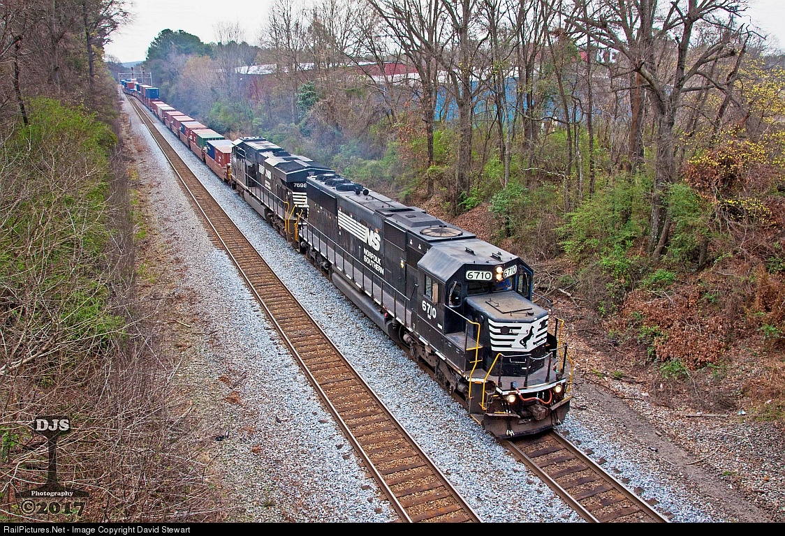 NS SD60 6710 leads Savannah to Atlanta intermodal train, 231 as it grinds up the NÂș2 main from CP Constitution. March 6, 2017