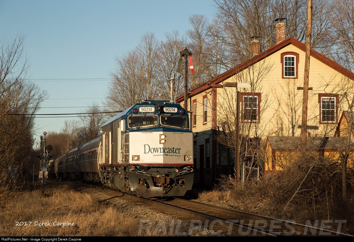 | As golden hour sets in, clean looking NPCU #90214 leads Amtrak Downeaster train 696 which is making good time passing the East Kingston B&M passenger station. |