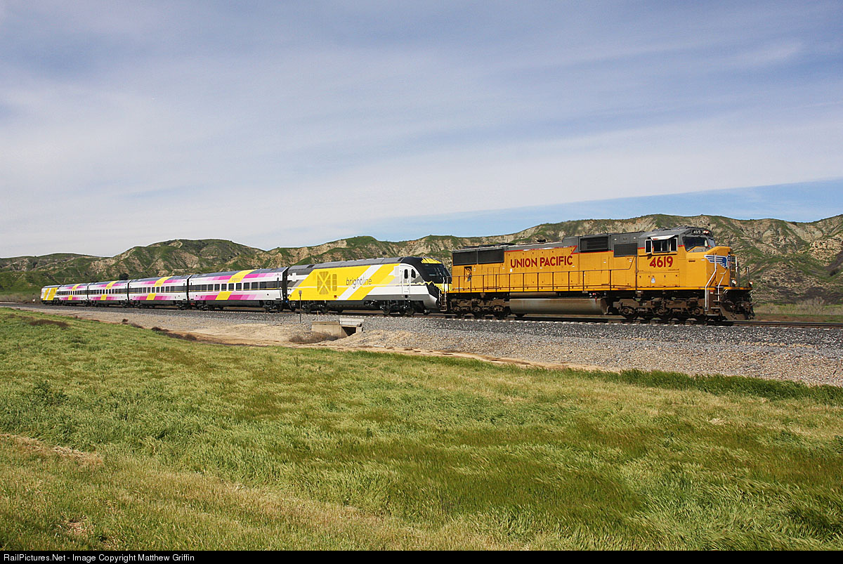 A single UP SD70 leads the SFLNO towing a newly built Brightline commuter train heading to Florida as it works up Beaumont Hill.