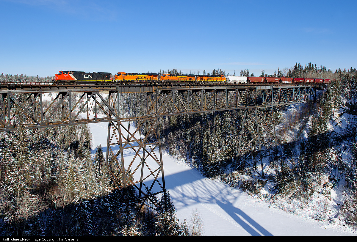 CN C44-9W 2566 teams up with BNSF ES44C4s 8355, 7190 and 4256 leading CN detour train F30541 05 across the Pembina River between Entwistle and Evansburg, Alberta. This is BNSF's G AVIKAL9 05 detouring from Noyes, MN to Vancouver, BC due to ongoing issues on BNSF's Hi-Line Subdivision in Montana.