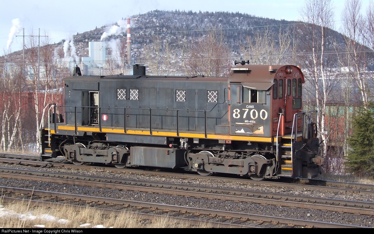 | After delivering a cut of empty woodchip cars to CP, the mill yard switcher runs light to the other end to fetch nine loads to deliver down to the mill for unloading. Marathon Pulp closed in March 2009, the mill was demolished years following. |