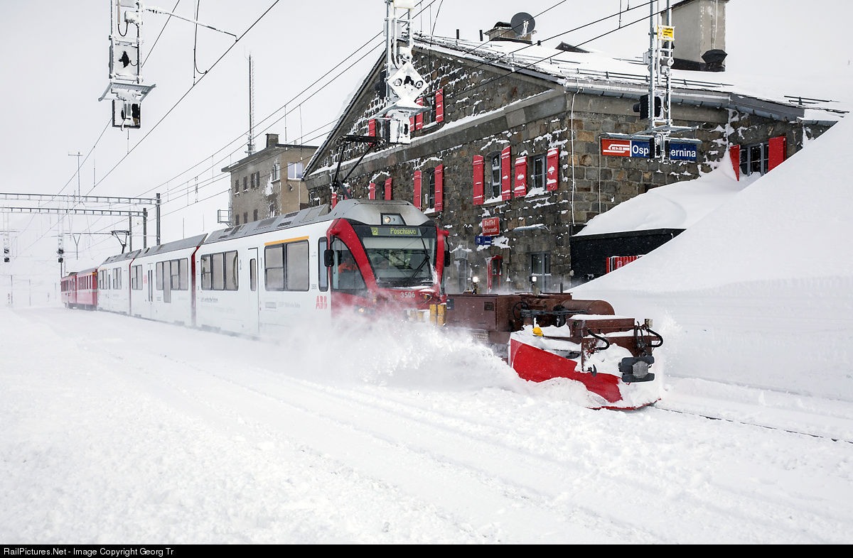 | Train 1621 from St.Moritz to Poschiavo is entering Ospizio Bernina, highest station of the Rhaetian Railway network, on 2256 meter a.s.l. "Allegra" railcar ABe 8/12 # 3506 with publicity paint scheme for ABB is shoving the flanger Xk 9132, which is removing the snow even several centimeter below the head of the rails. The blades of the flanger are remote controlled (lowered/raised) from the cab of the Allegra by a maintenance of way crew member. |