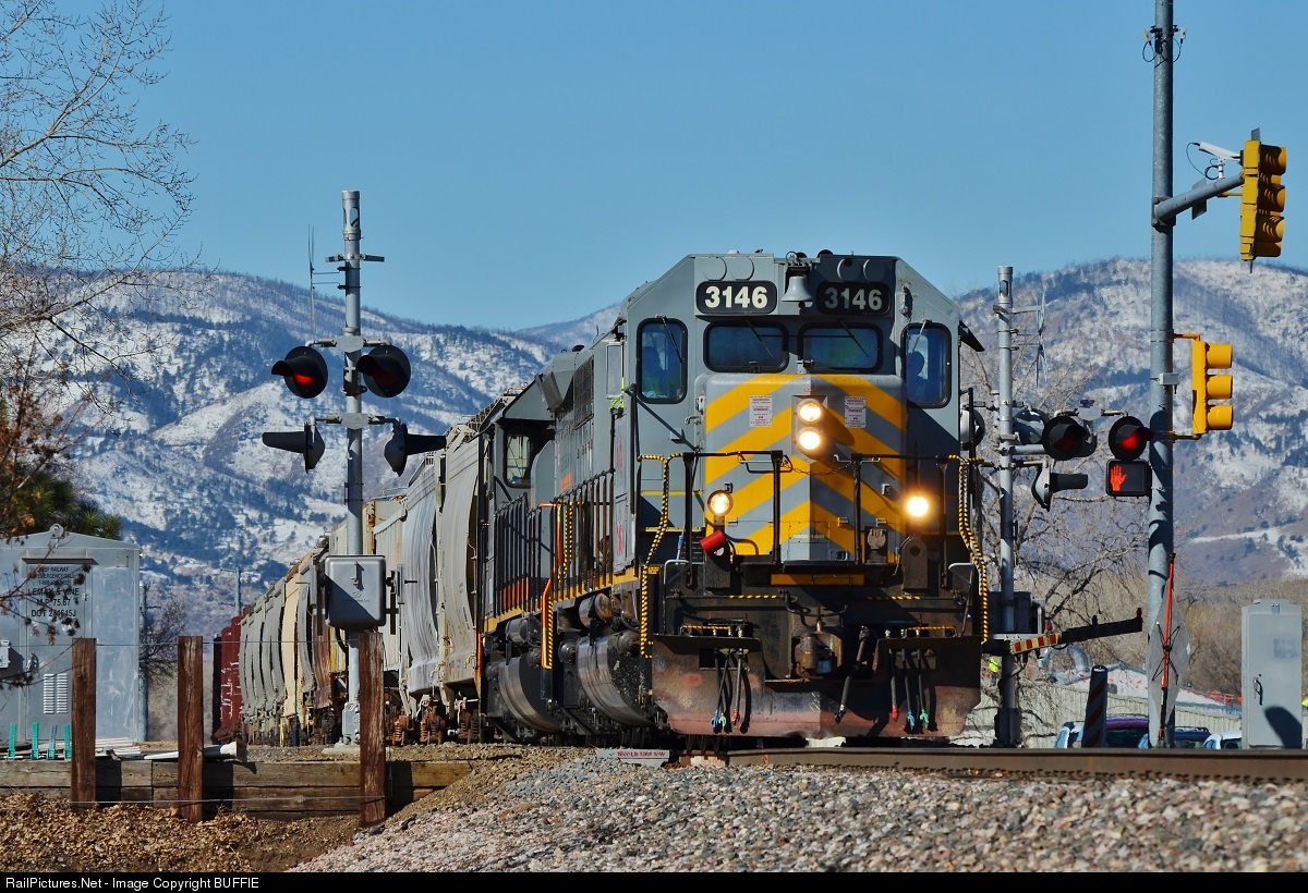 | OMLX 3146, an ex-Kansas City Southern SD40-3 heads into the BNSF North Yard in Fort Collins with a load of hoppers picked up from the New Belgium Brewing Company. |