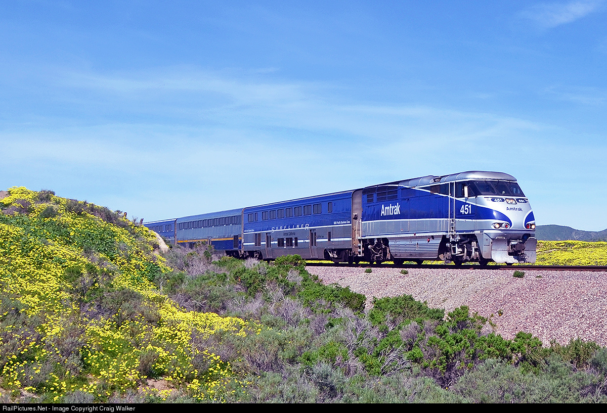 California's exceptionally wet winter is, by early March, beginning to yield colorful dividends as Amtrak Pacific Surfliner #768 passes through the United States Marine Corps' Camp Pendleton as it makes it way from Goleta to San Diego. Amtrak F59PHI 451 is leading the train on March 7, 2017.
