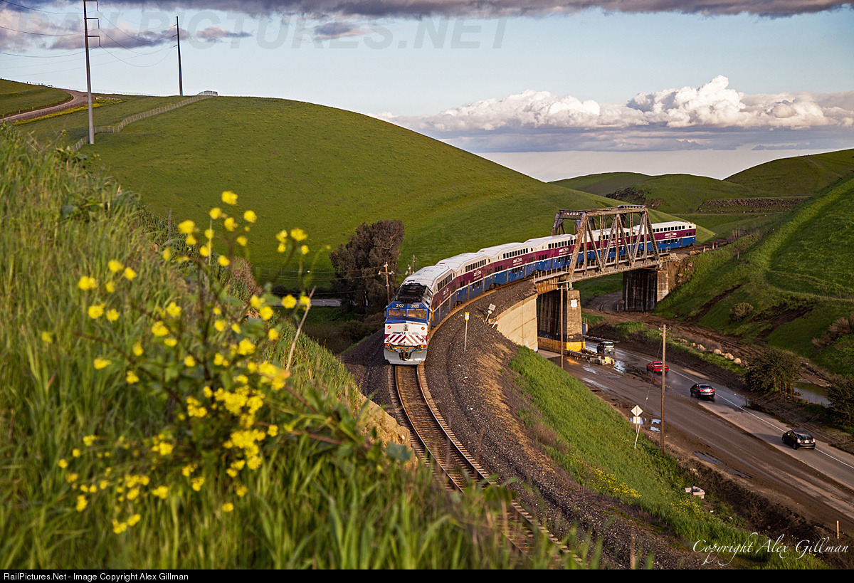 With looming thunderheads providing the backdrop, ACE 4, the first eastbound train of the day, curves through Altamont Pass and over the original 1915-built, Western Pacific Railroad bridge on its way to Stockton.