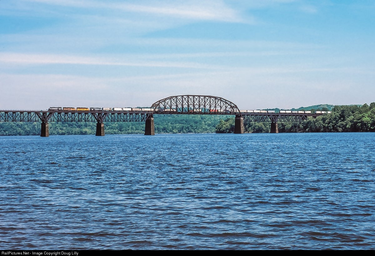 A combination of RF&P and B&O geeps lead the southbound Orange Blossom Special across the Susquehanna River at Havre de Grace, Maryland. The Kearney, New Jersey – Tampa, Florida intermodal ran between Kearney and Richmond without a power change, necessitating an RF&P leader to work with the RF&P’s cab signal system.
