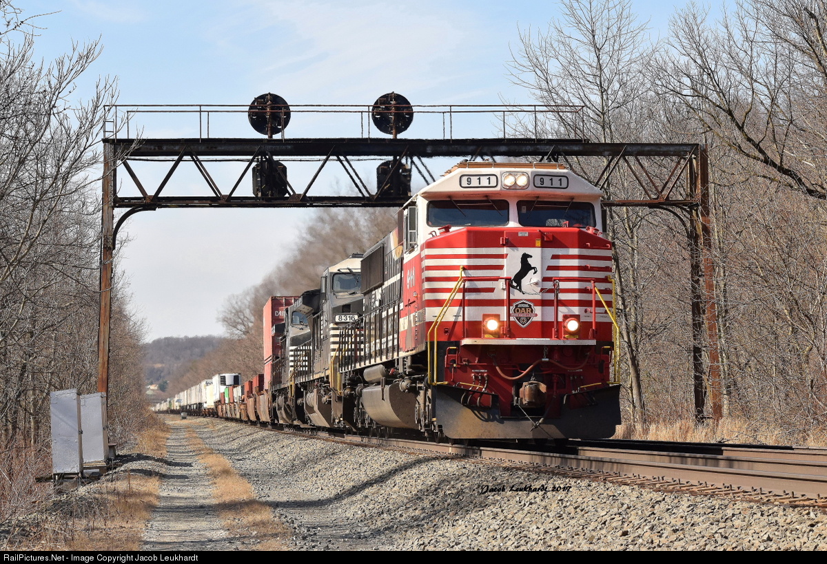 | NS 22W rolls under the Pennsy position light signals guarding CP RADE near Greensburg, Pennsylvania. The train was being led by Norfolk Southern's Honoring our First Responders SD60E. |