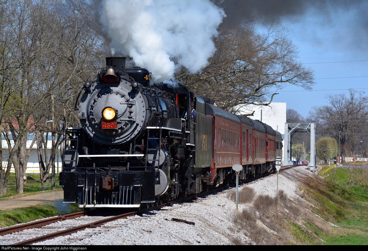 | Having just crossed over the Chattooga River bridge, seen in the distance, Southern 4501 accelerates the “Summerville Steam Special” towards its destination on a beautiful March day in northwest Georgia. This was the first of twenty scheduled TVRM “Summerville Steam Specials” in 2017. These trips operate over a former Central of Georgia line which is now owned by the state and operated by the Chattooga & Chickamauga Railway. |