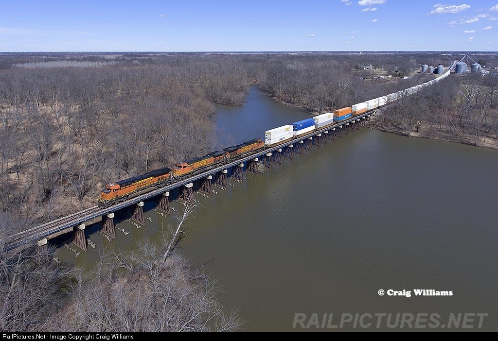 A strong line of thunderstorms ahead of a cold front pushed thru Missouri with straight line winds and tornadoes during the evening on March 6th. Strong winds ended up knocking over a complete Q-train west of Mendon causing a major mess for the BNSF. The Marceline Sub was brought to a halt for roughly 24 hours while cleanup was done to the main around MP 366. Around 10 trains were able to detour via between the Bucklin and KC on the Brookfield Sub. The BNSF has a northwest connection between the Brookfield Sub and the Marceline Sub at Bucklin. Lack of qualified crews and capacity (stored cars on sidings) limited the detours. So only hot trains and Amtrak were detoured during the 24 hour cleanup. One detour was this Z-WSPALT8-06A. Seen here from the sky crossing the Stanley Lake near Sumner, 14 miles west of Brookfield. This train would meet detouring Amtrak # 4 at Aalberg.