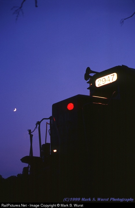 | NS "PRSL" style GP38, still in CR Operation Lifesaver paint, waits crewless under a setting moon at WK for a relief crew to finish bringing the train the rest of the way into Allentown Yard. |