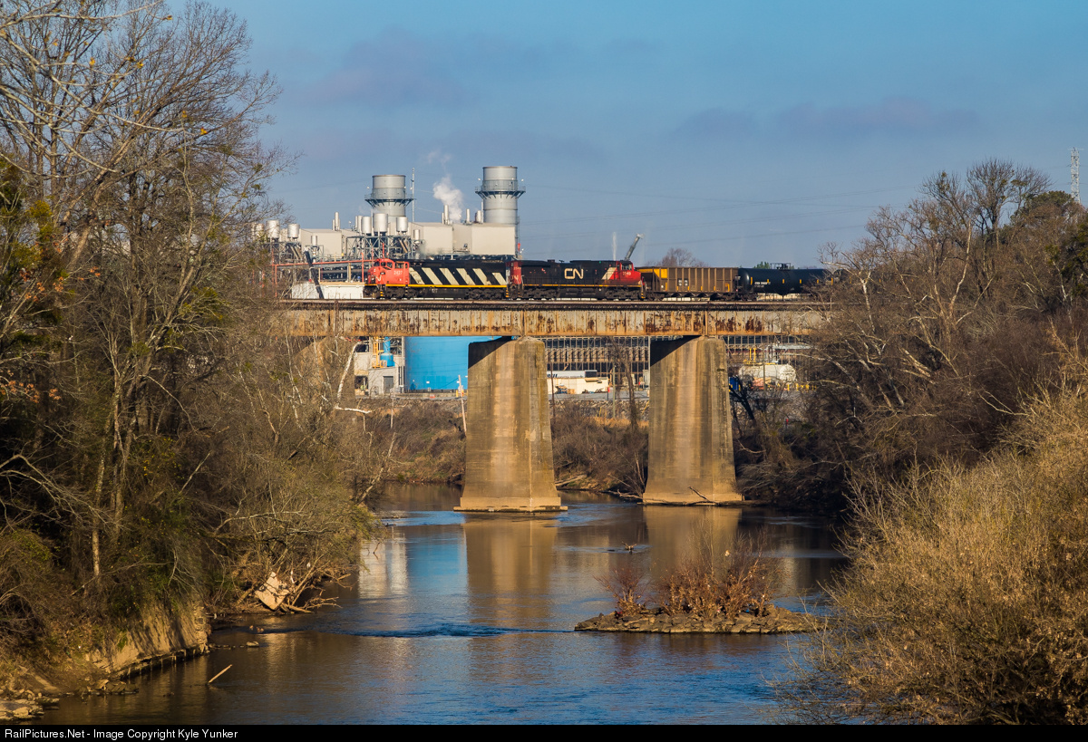 CN C40-8M #2427 & C44-9W #2549 bring the loaded ethanol train CSX K445 across the Chattahoochee River just before 9am as it enters Atlanta city limits. Georgia Power's Plant McDonough-Atkinson is seen in the background.