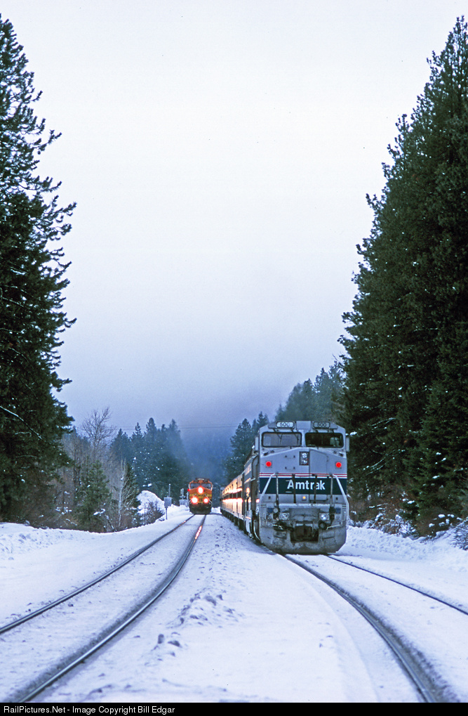 | Amtrak 500 brings up the rear of the Leavenworth Snow Train as it waits in Winton siding for a BNSF freight to roll by westbound. The train is en route to Leavenworth for an afternoon of snowy activities and a Christmas tree lighting ceremony. It will return west to Seattle after dark. This season a GE was operated on each end, push pull style. The car in front of the locomotive is a former GN full length dome. |