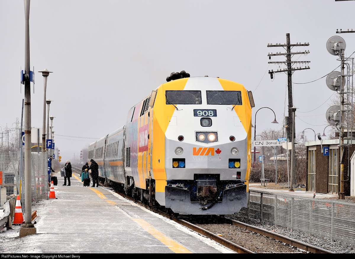 | More and more wraps. More and more VIA engines are getting wrapped for Canada's 150th anniversary this year, with 22 to be painted in total. Here wrapped VIA 908 leads VIA 60 which is discharging passengers at Dorval Station. |