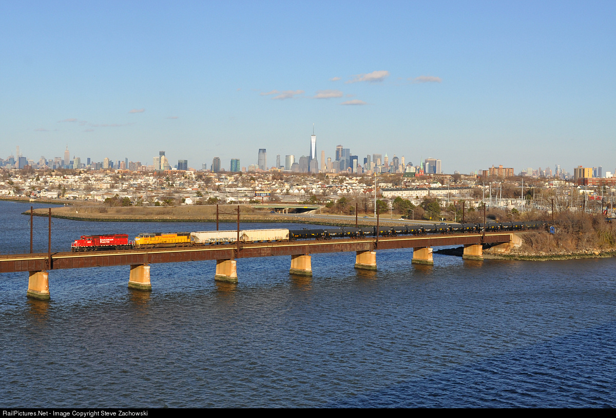 A loaded Chemical Coast bound ethanol train crosses Upper Bay Bridge behind an eclectic EMD pair in astonishing golden hour light. Shining bright due to the low lying sun and standing above the rest of the skyscrapers in the Manhatran Skyline is One World Trade Center. At 1776 feet tall, One World Trade Center is the tallest building in the Western Hemisphere. |