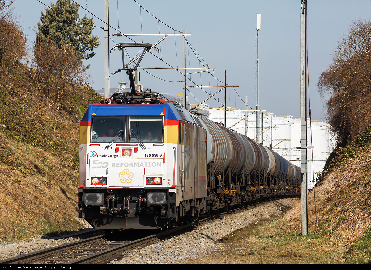 Bombardier TRAXX F140 AC2 locomotive 185 # 589 of RheinCargo (property of leasing company Macquarie European Rail Limited) got a publicity paint scheme for "500 Jahre Reformation" (celebrating the 'Martin Luther-year 2017'). The locomotive is leaving the Tägerschen fuel depot in Bettwiesen with an empty tank car train, on the line Weinfelden-Wil (SG) of the former Mittel-Thurgau-Bahn MThB.